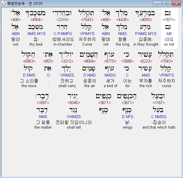 헬라어구약Septuagint,20 και γε εν συνειδησει σου βασιλεα μη καταραση και εν ταμιειοις κοιτωνων σου μη καταραση πλουσιον οτι πετεινον του ουρανου αποισει συν την φωνην και ο εχων τας πτερυγας απαγγελει λογον