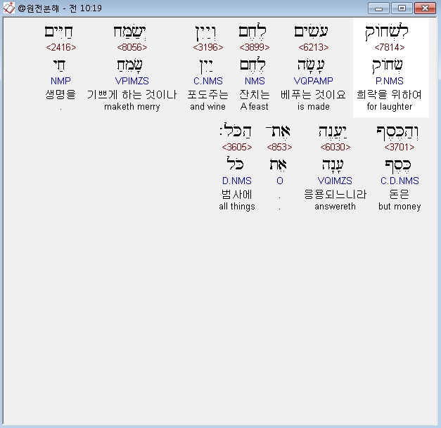 히브리어구약BHS,19 לִשְׂחֹוק עֹשִׂים לֶחֶם וְיַיִן יְשַׂמַּח חַיִּים וְהַכֶּסֶף יַעֲנֶה אֶת־הַכֹּל׃