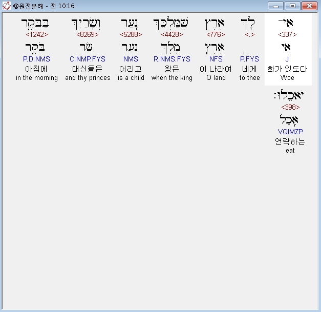 히브리어구약BHS,16 אִי־לָךְ אֶרֶץ שֶׁמַּלְךֵּךְ נָעַר וְשָׂרַיִךְ בַּבֹּקֶר יֹאכֵלוּ׃