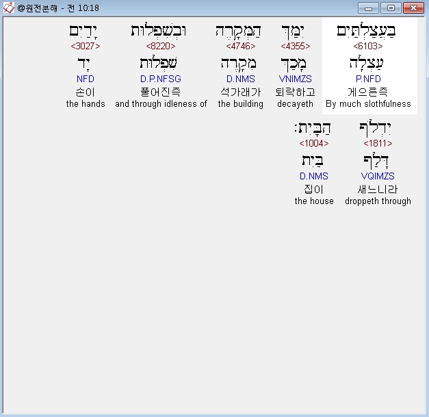 히브리어구약BHS,18 בַּעֲצַלְתַּיִם יִמַּךְ הַמְּקָרֶה וּבְשִׁפְלוּת יָדַיִם יִדְלֹף הַבָּיִת׃