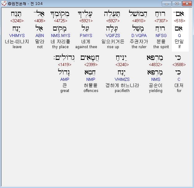 히브리어구약BHS,4 אִם־רוּחַ הַמֹּושֵׁל תַּעֲלֶה עָלֶיךָ מְקֹומְךָ אַל־תַּנַּח כִּי מַרְפֵּא יַנִּיחַ חֲטָאִים גְּדֹולִים׃
