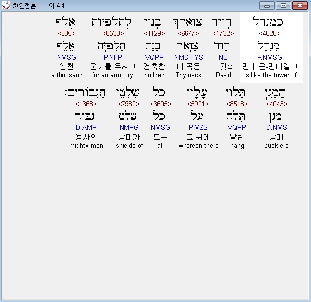 히브리어구약BHS,4 כְּמִגְדַּל* דָּוִיד צַוָּארֵךְ בָּנוּי לְתַלְפִּיֹּות אֶלֶף הַמָּגֵן תָּלוּי עָלָיו כֹּל שִׁלְטֵי הַגִּבֹּורִים׃