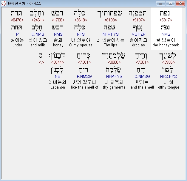 히브리어구약BHS,11 נֹפֶת תִּטֹּפְנָה שִׂפְתֹותַיִךְ כַּלָּה דְּבַשׁ וְחָלָב תַּחַת לְשֹׁונֵךְ וְרֵיחַ שַׂלְמֹתַיִךְ כְּרֵיחַ לְבָנֹון׃ ס