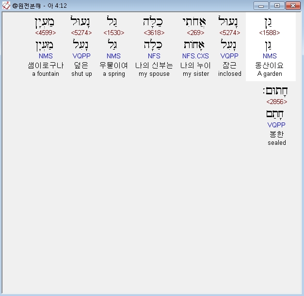 히브리어구약BHS,12 גַּן נָעוּל אֲחֹתִי כַלָּה גַּל נָעוּל מַעְיָן חָתוּם׃