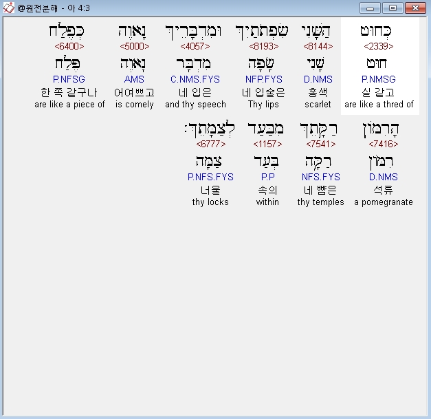 히브리어구약BHS,3 כְּחוּט הַשָּׁנִי שִׂפְתֹתַיִךְ וּמִדְבָּרֵיךְ נָאוֶה כְּפֶלַח הָרִמֹּון רַקָּתֵךְ מִבַּעַד לְצַמָּתֵךְ׃