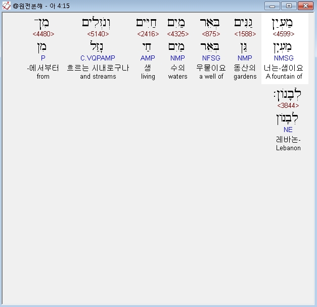 히브리어구약BHS,15 מַעְיַן גַּנִּים בְּאֵר מַיִם חַיִּים וְנֹזְלִים מִן־לְבָנֹון׃