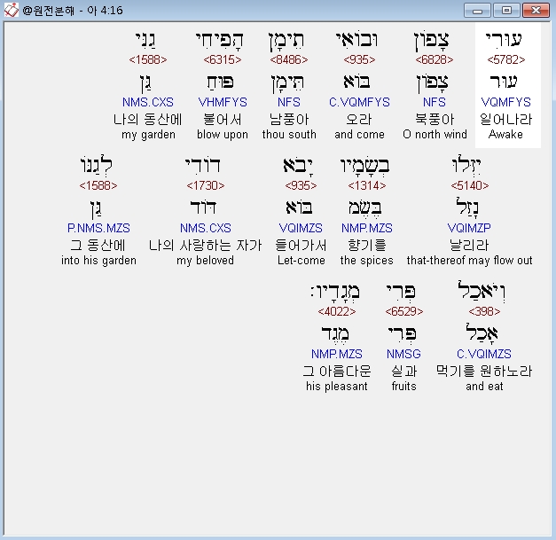 히브리어구약BHS,16 עוּרִי צָפֹון וּבֹואִי תֵימָן הָפִיחִי גַנִּי יִזְּלוּ בְשָׂמָיו יָבֹא דֹודִי לְגַנֹּו וְיֹאכַל פְּרִי מְגָדָיו׃