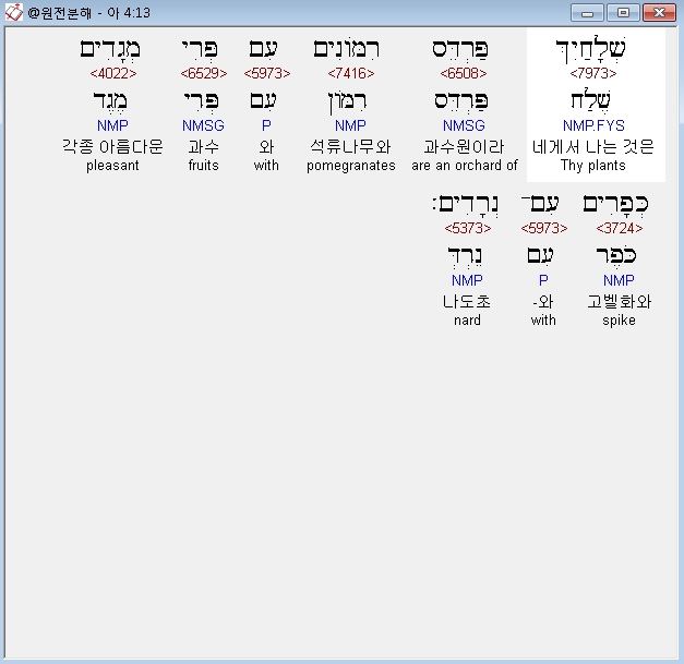 히브리어구약BHS,13 שְׁלָחַיִךְ פַּרְדֵּס רִמֹּונִים עִם פְּרִי מְגָדִים כְּפָרִים עִם־נְרָדִים׃