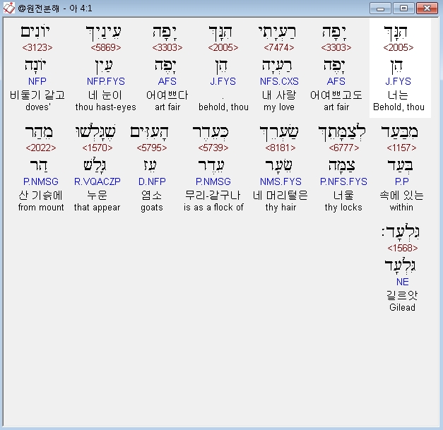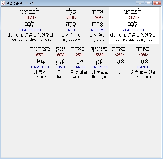 | 히브리어 아가 1장 전체 원어 원문 성경 공부 주석 강해 설교 해설 해석 (0) | 2020.10.16 |
