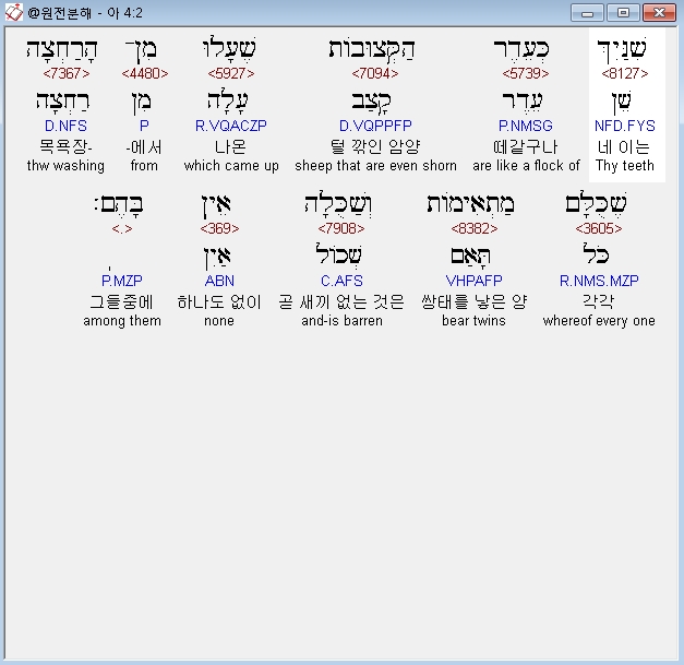 히브리어구약BHS,2 שִׁנַּיִךְ כְּעֵדֶר הַקְּצוּבֹות שֶׁעָלוּ מִן־הָרַחְצָה שֶׁכֻּלָּם מַתְאִימֹות וְשַׁכֻּלָה אֵין בָּהֶם׃