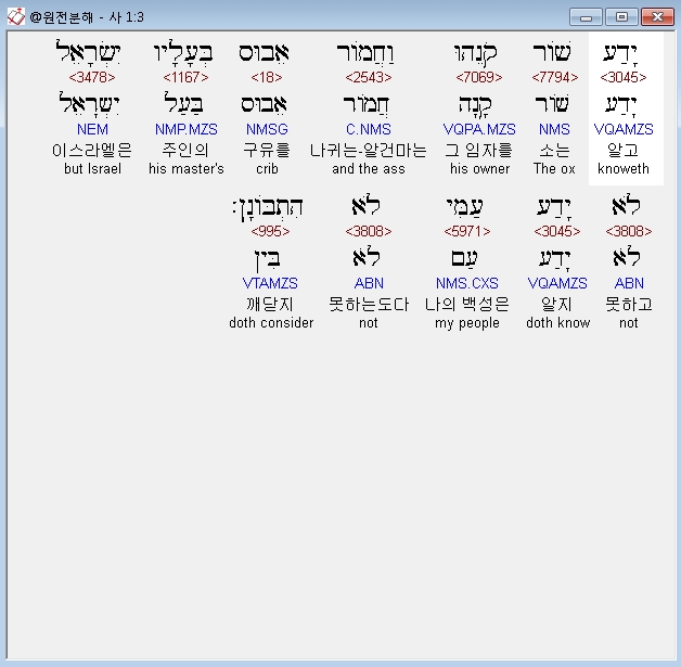히브리어구약BHS,3 יָדַע שֹׁור קֹנֵהוּ וַחֲמֹור אֵבוּס בְּעָלָיו יִשְׂרָאֵל לֹא יָדַע עַמִּי לֹא הִתְבֹּוןָן׃