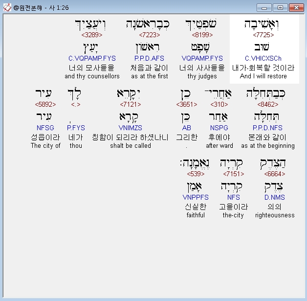 히브리어구약BHS,26 וְאָשִׁיבָה שֹׁפְטַיִךְ כְּבָרִאשֹׁנָה וְיֹעֲצַיִךְ כְּבַתְּחִלָּה אַחֲרֵי־כֵן יִקָּרֵא לָךְ עִיר הַצֶּדֶק קִרְיָה נֶאֱמָנָה׃