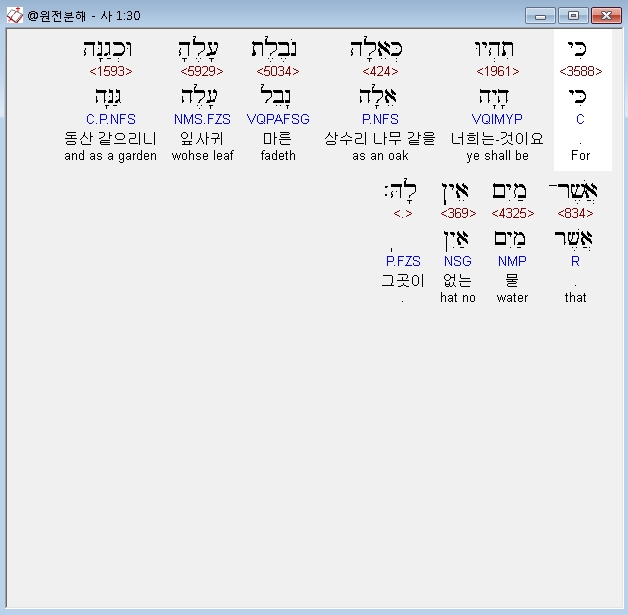 히브리어구약BHS,30 כִּי תִהְיוּ כְּאֵלָה נֹבֶלֶת עָלֶהָ וּכְגַנָּה אֲשֶׁר־מַיִם אֵין לָהּ׃