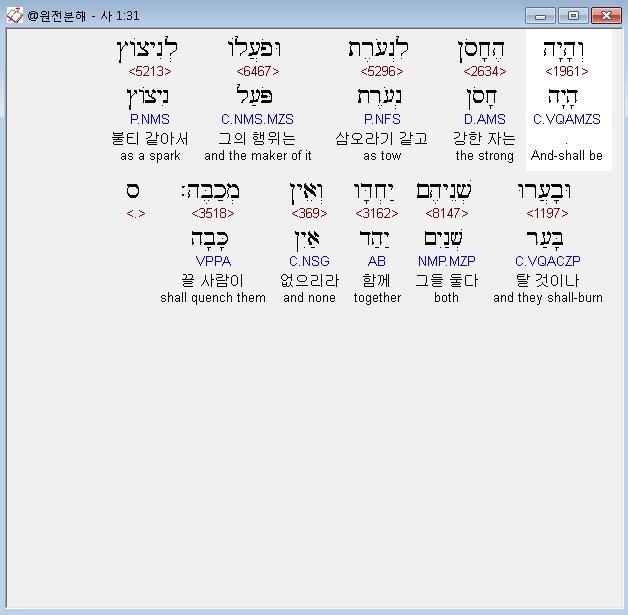 히브리어구약BHS,31 וְהָיָה הֶחָסֹן לִנְעֹרֶת וּפֹעֲלֹו לְנִיצֹוץ וּבָעֲרוּ שְׁנֵיהֶם יַחְדָּו וְאֵין מְכַבֶּה׃ ס