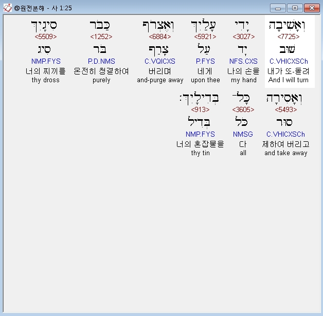 히브리어구약BHS,25 וְאָשִׁיבָה יָדִי עָלַיִךְ וְאֶצְרֹף כַּבֹּר סִיגָיִךְ וְאָסִירָה כָּל־בְּדִילָיִךְ׃