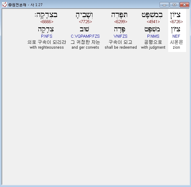 히브리어구약BHS,27 צִיֹּון בְּמִשְׁפָּט תִּפָּדֶה וְשָׁבֶיהָ בִּצְדָקָה׃