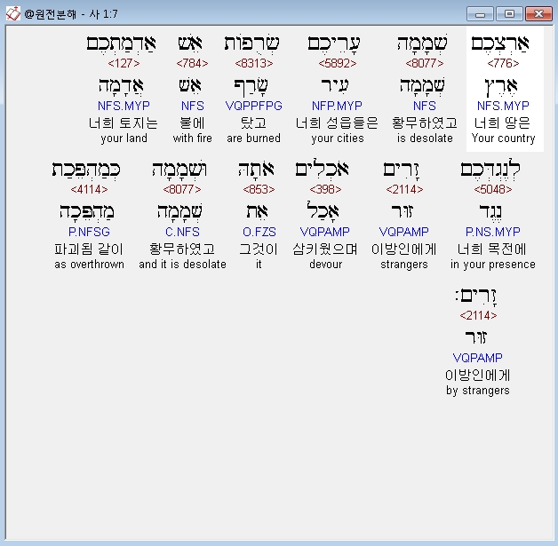 개역개정,7 너희의 땅은 황폐하였고 너희의 성읍들은 불에 탔고 너희의 토지는 너희 목전에서 이방인에게 삼켜졌으며 이방인에게 파괴됨 같이 황폐하였고