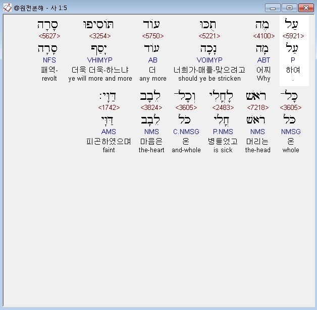 히브리어구약BHS,5 עַל מֶה תֻכּוּ עֹוד תֹּוסִיפוּ סָרָה כָּל־רֹאשׁ לָחֳלִי וְכָל־לֵבָב דַּוָּי׃