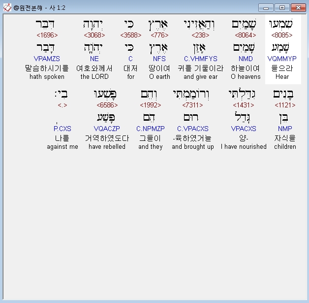 히브리어구약BHS,2 שִׁמְעוּ שָׁמַיִם וְהַאֲזִינִי אֶרֶץ כִּי יְהוָה דִּבֵּר בָּנִים גִּדַּלְתִּי וְרֹומַמְתִּי וְהֵם פָּשְׁעוּ בִי׃