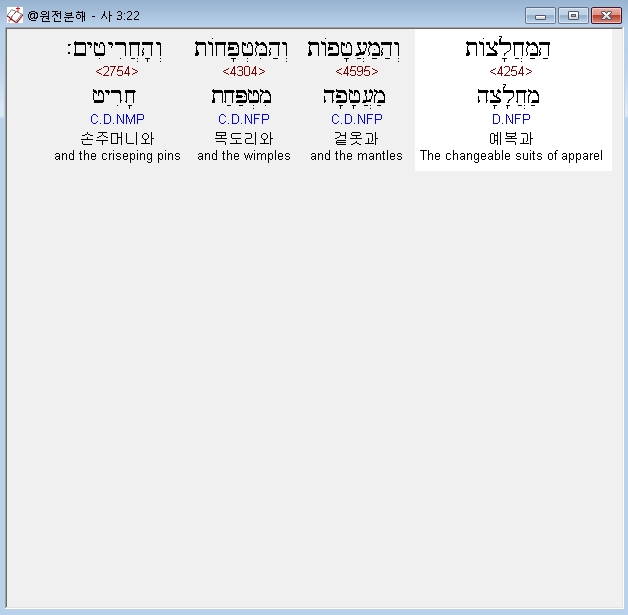 히브리어구약BHS,22 הַמַּחֲלָצֹות וְהַמַּעֲטָפֹות וְהַמִּטְפָּחֹות וְהָחֲרִיטִים׃
