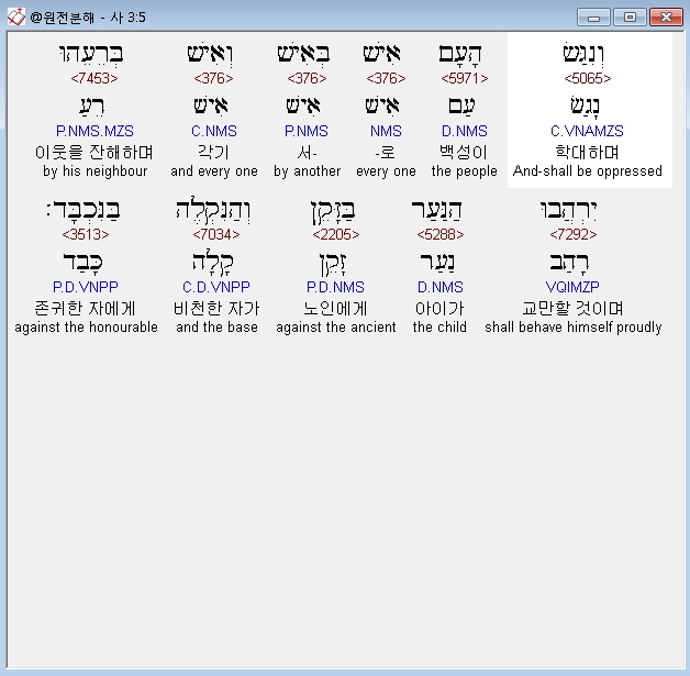영어NRSV,5 The people will be oppressed, everyone by another and everyone by a neighbor; the youth will be insolent to the elder, and the base to the honorable.