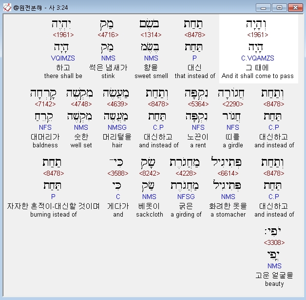 히브리어구약BHS,24 וְהָיָה תַחַת בֹּשֶׂם מַק יִהְיֶה וְתַחַת חֲגֹורָה נִקְפָּה וְתַחַת מַעֲשֶׂה מִקְשֶׁה קָרְחָה וְתַחַת פְּתִיגִיל מַחֲגֹרֶת שָׂק כִּי־תַחַת יֹפִי׃