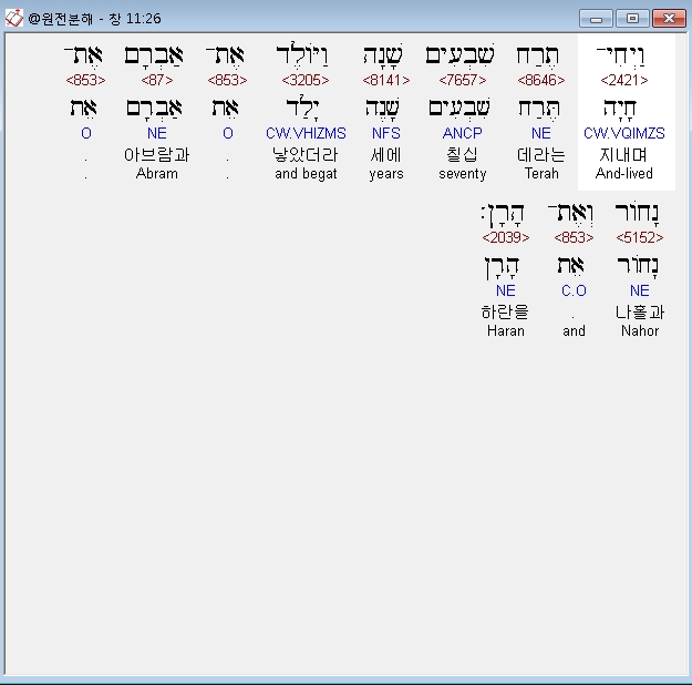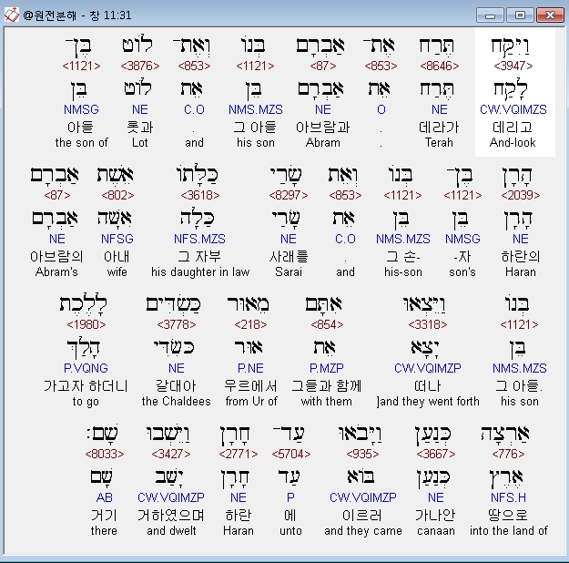 와이카흐 테라흐 엩 아브람 베노 웨엩 롵 벤 하란 벤 베노 웨에트 사라이 칼라토 에쉐트 아브람 베노 와예체우 잍탐 메우르 카스딤 랄레케트 알차 케나안 와야보우 아드 하란 와예쉐부 솸