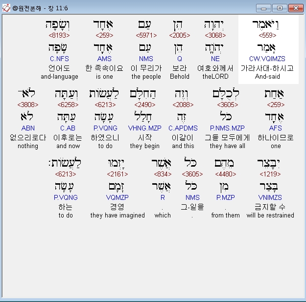 개역개정,6 여호와께서 이르시되 이 무리가 한 족속이요 언어도 하나이므로 이같이 시작하였으니 이 후로는 그 하고자 하는 일을 막을 수 없으리로다