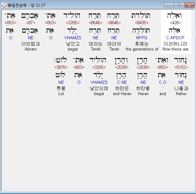 히브리어구약BHS,27 וְאֵלֶּה תֹּולְדֹת תֶּרַח תֶּרַח הֹולִיד אֶת־אַבְרָם אֶת־נָחֹור וְאֶת־הָרָן וְהָרָן הֹולִיד אֶת־לֹוט׃