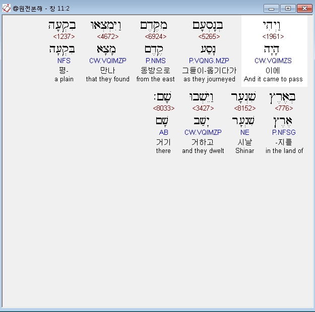 히브리어구약BHS,2 וַיְהִי בְּנָסְעָם מִקֶּדֶם וַיִּמְצְאוּ בִקְעָה בְּאֶרֶץ שִׁנְעָר וַיֵּשְׁבוּ שָׁם׃