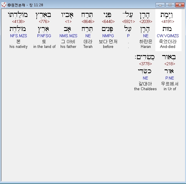 히브리어구약BHS,28 וַיָּמָת הָרָן עַל־פְּנֵי תֶּרַח אָבִיו בְּאֶרֶץ מֹולַדְתֹּו בְּאוּר כַּשְׂדִּים׃