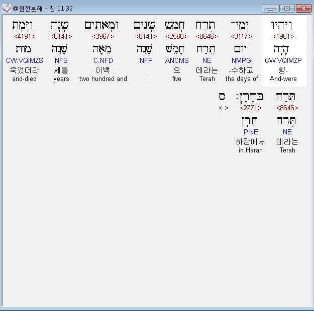 히브리어구약BHS,32 וַיִּהְיוּ יְמֵי־תֶרַח חָמֵשׁ שָׁנִים וּמָאתַיִם שָׁנָה וַיָּמָת תֶּרַח בְּחָרָן׃ ס