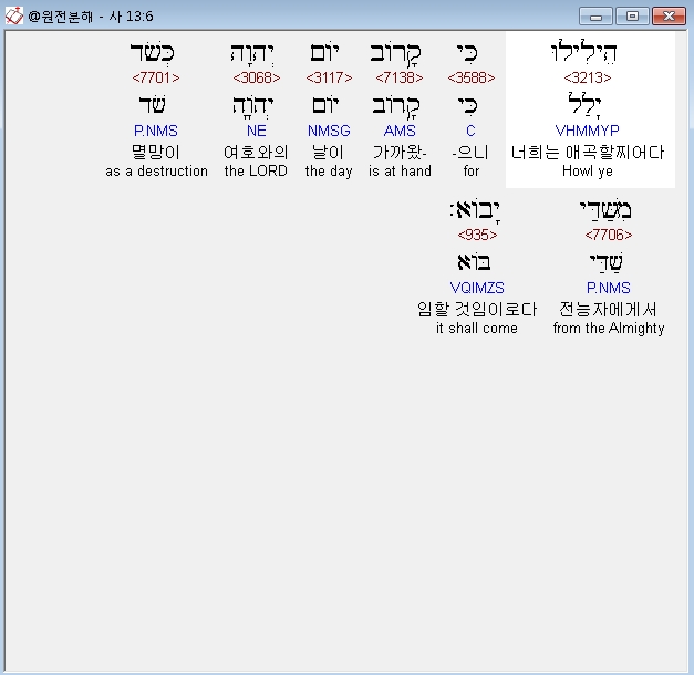 히브리어구약BHS,6 הֵילִילוּ כִּי קָרֹוב יֹום יְהוָה כְּשֹׁד מִשַּׁדַּי יָבֹוא׃