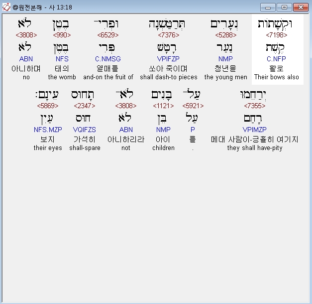 히브리어구약BHS,18 וּקְשָׁתֹות נְעָרִים תְּרַטַּשְׁנָה וּפְרִי־בֶטֶן לֹא יְרַחֵמוּ עַל־בָּנִים לֹא־תָחוּס עֵינָם׃