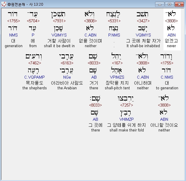 히브리어구약BHS,20 לֹא־תֵשֵׁב לָנֶצַח וְלֹא תִשְׁכֹּן עַד־דֹּור וָדֹור וְלֹא־יַהֵל שָׁם עֲרָבִי וְרֹעִים לֹא־יַרְבִּצוּ שָׁם׃