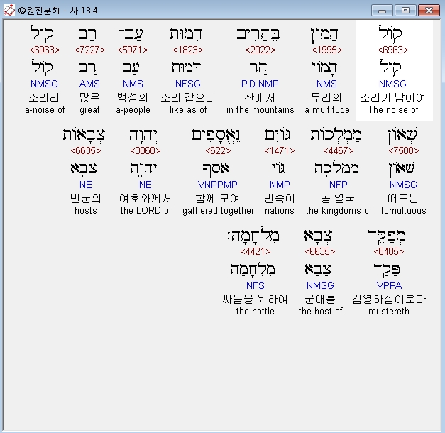 히브리어구약BHS,4 קֹול הָמֹון בֶּהָרִים דְּמוּת עַם־רָב קֹול שְׁאֹון מַמְלְכֹות גֹּויִם נֶאֱסָפִים יְהוָה צְבָאֹות מְפַקֵּד צְבָא מִלְחָמָה׃