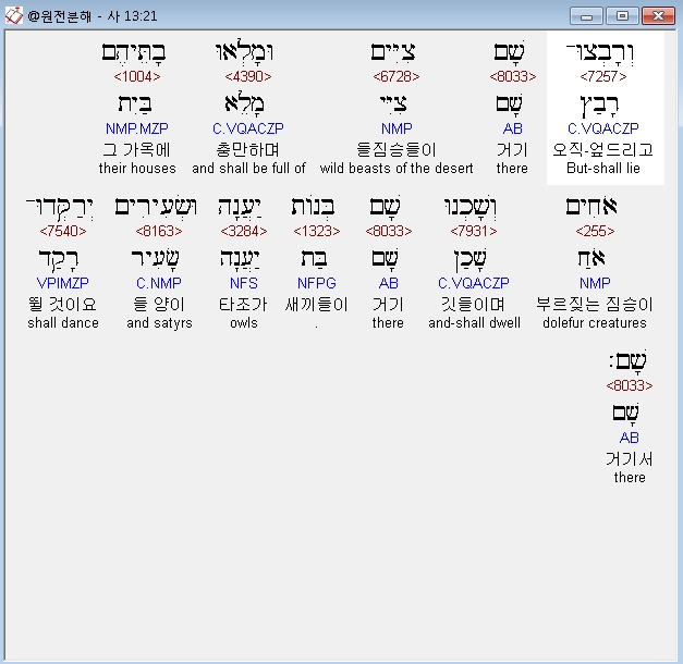 히브리어구약BHS,21 וְרָבְצוּ־שָׁם צִיִּים וּמָלְאוּ בָתֵּיהֶם אֹחִים וְשָׁכְנוּ שָׁם בְּנֹות יַעֲנָה וּשְׂעִירִים יְרַקְּדוּ־שָׁם׃