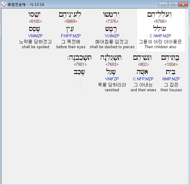 히브리어구약BHS,16 וְעֹלְלֵיהֶם יְרֻטְּשׁוּ לְעֵינֵיהֶם יִשַּׁסּוּ בָּתֵּיהֶם וּנְשֵׁיהֶם [כ= תִּשָּׁגַלְנָה] [ק= תִּשָּׁכַבְנָה]׃