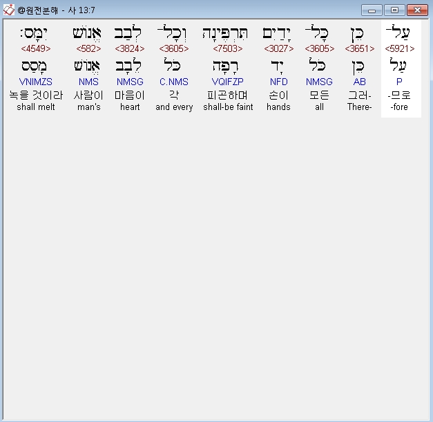 히브리어구약BHS,7 עַל־כֵּן כָּל־יָדַיִם תִּרְפֶּינָה וְכָל־לְבַב אֱנֹושׁ יִמָּס׃*