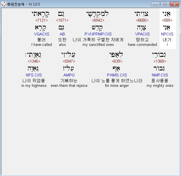 히브리어구약BHS,3 אֲנִי צִוֵּיתִי לִמְקֻדָּשָׁי גַּם קָרָאתִי גִבֹּורַי לְאַפִּי עַלִּיזֵי גַּאֲוָתִי׃