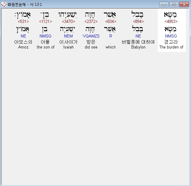 히브리어구약BHS,1 מַשָּׂא בָּבֶל אֲשֶׁר חָזָה יְשַׁעְיָהוּ בֶּן־אָמֹוץ׃