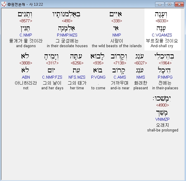 히브리어구약BHS,22 וְעָנָה אִיִּים בְּאַלְמְנֹותָיו וְתַנִּים בְּהֵיכְלֵי עֹנֶג וְקָרֹוב לָבֹוא עִתָּהּ וְיָמֶיהָ לֹא יִמָּשֵׁכוּ׃