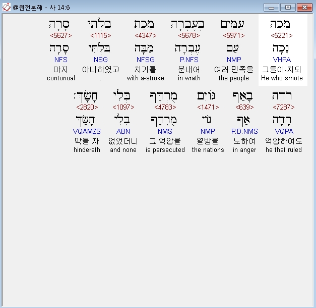 히브리어구약BHS,6 מַכֶּה עַמִּים בְּעֶבְרָה מַכַּת בִּלְתִּי סָרָה רֹדֶה בָאַף גֹּויִם מֻרְדָּף בְּלִי חָשָׂךְ׃