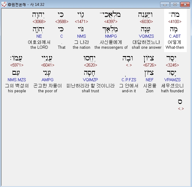 히브리어구약BHS,32 וּמַה־יַּעֲנֶה מַלְאֲכֵי־גֹוי כִּי יְהוָה יִסַּד צִיֹּון וּבָהּ יֶחֱסוּ עֲנִיֵּי עַמֹּו׃ ס