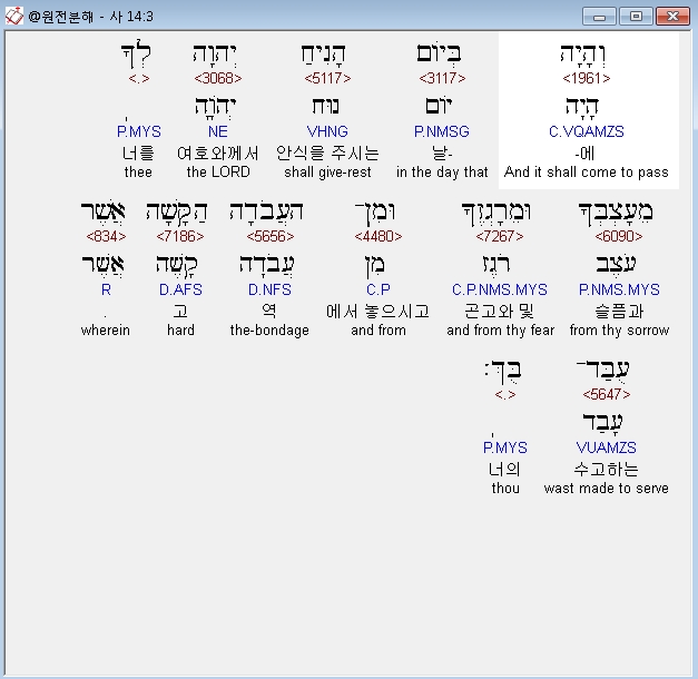 히브리어구약BHS,3 וְהָיָה בְּיֹום הָנִיחַ יְהוָה לְךָ מֵעָצְבְּךָ וּמֵרָגְזֶךָ וּמִן־הָעֲבֹדָה הַקָּשָׁה אֲשֶׁר עֻבַּד־בָּךְ׃