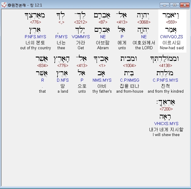 히브리어구약BHS,1 וַיֹּאמֶר יְהוָה אֶל־אַבְרָם לֶךְ־לְךָ מֵאַרְצְךָ וּמִמֹּולַדְתְּךָ וּמִבֵּית אָבִיךָ אֶל־הָאָרֶץ אֲשֶׁר אַרְאֶךָּ׃