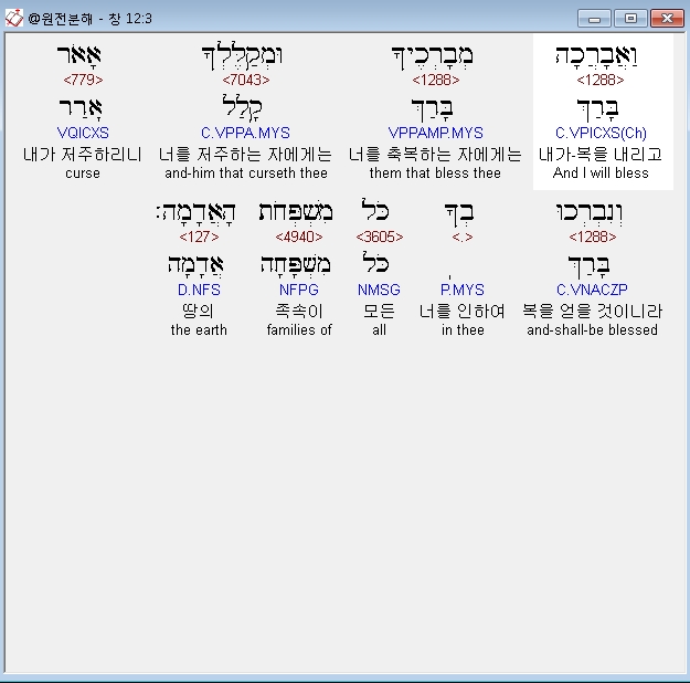 히브리어구약BHS,3 וַאֲבָרֲכָה מְבָרְכֶיךָ וּמְקַלֶּלְךָ אָאֹר וְנִבְרְכוּ בְךָ כֹּל מִשְׁפְּחֹת הָאֲדָמָה׃