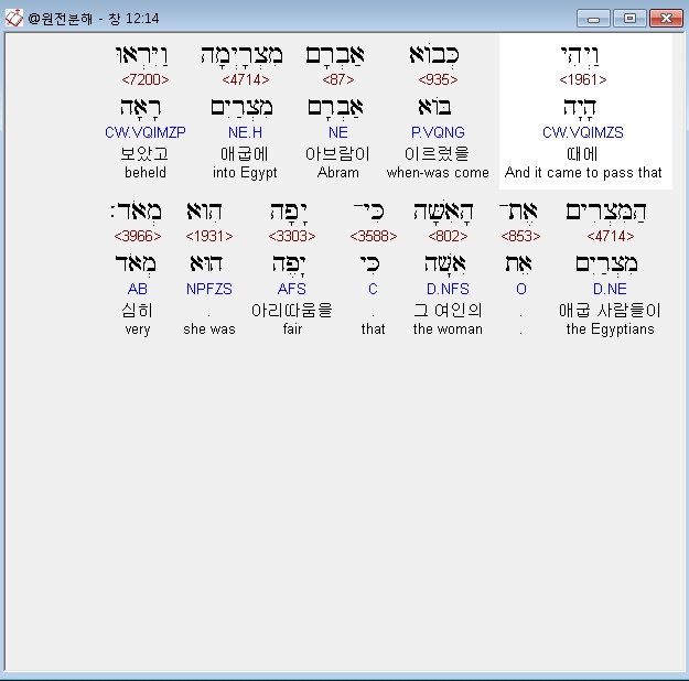 히브리어구약BHS,14 וַיְהִי כְּבֹוא אַבְרָם מִצְרָיְמָה וַיִּרְאוּ הַמִּצְרִים אֶת־הָאִשָּׁה כִּי־יָפָה הִוא מְאֹד׃