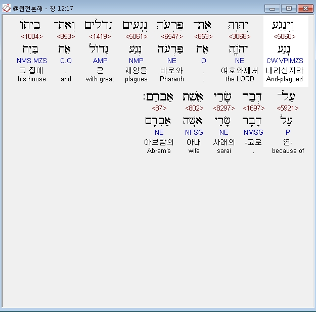 히브리어구약BHS,17 וַיְנַגַּע יְהוָה אֶת־פַּרְעֹה נְגָעִים גְּדֹלִים וְאֶת־בֵּיתֹו עַל־דְּבַר שָׂרַי אֵשֶׁת אַבְרָם׃