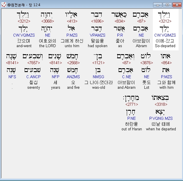 영어NASB,4 So Abram went forth as the LORD had spoken to him; and Lot went with him. Now Abram was seventy-five years old when he departed from Haran.